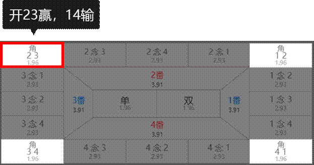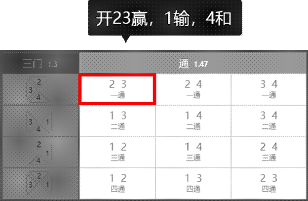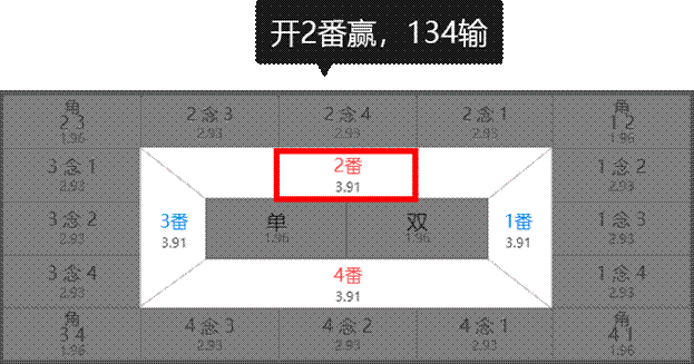 例:投注 :2,3 一通,结果余数为 2,3 则中奖,开出 1 则输,4 为和局。