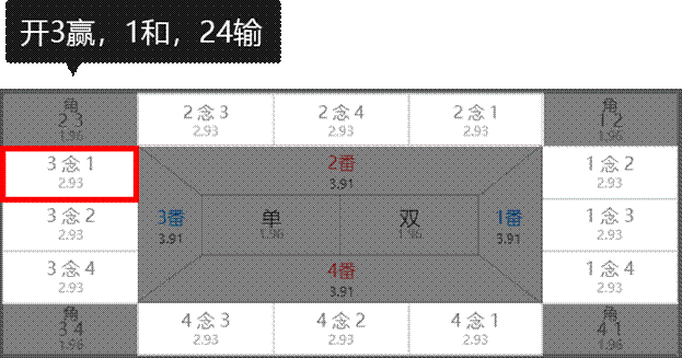 例:投注 :3 念 1, 结果开出:3 则中奖,开出 1 则和局,开出 2,4 为输。