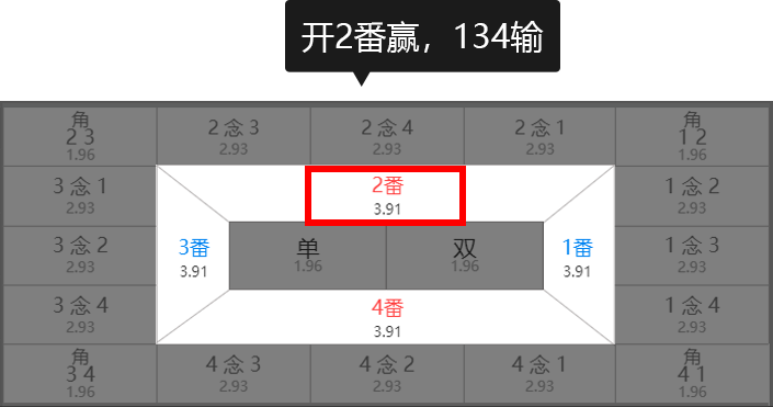 例:投注 :2,3 一通,冠亚季结果余数为 2 或 3 则中奖,开出1则输,4 为和局。