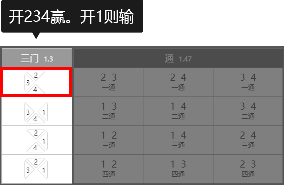 三门玩法注解:选择三个号码的组合,开出为赢,其余为输。