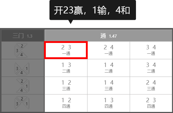 例:投注 :2,3 一通,后三结果余数为 2,3 则中奖,开出 1 则输,4 为和局。