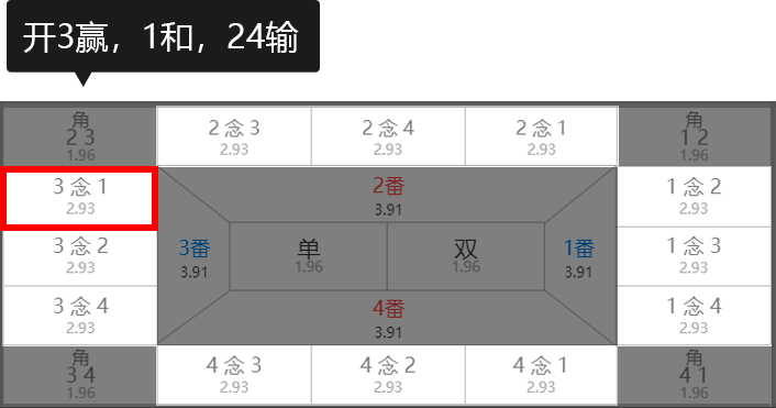 念玩法注解:投注两个号码,选定其一为赢,念为和,其余两个为输。