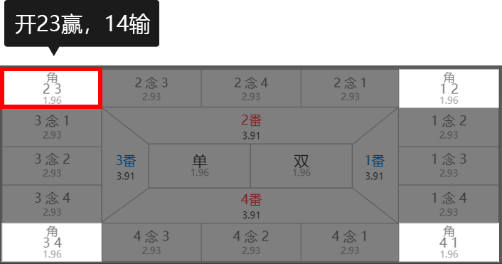 角玩法注解:投注两个号码,开出为赢,其余为输。