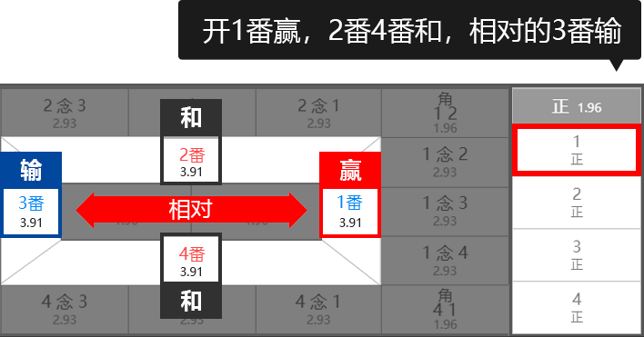例1:投注 : 1 正 ,结果开出:1 则中奖,开出 3 则输,反之开出 2 或 4 则和局。