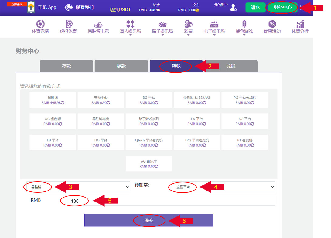 - 登陆易胜博主页后,点击'财务中心'按钮(于主页右上角)选择 '转账'